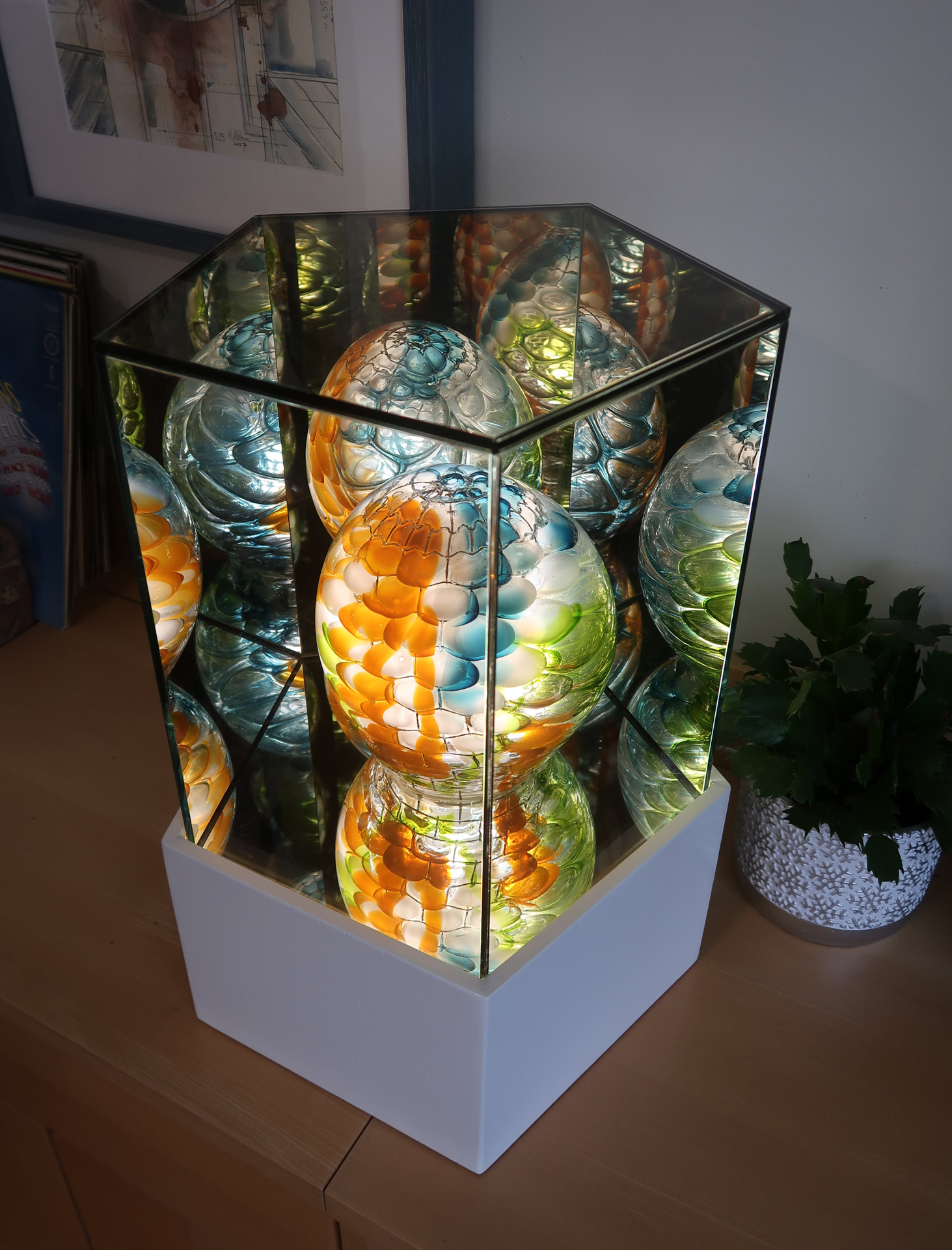 Meine Lichtboxen bieten eine interessante neue Möglichkeit dreidimensionale Objekte zu präsentieren. Durch die Mehrfachspiegelung schafft man nicht nur einen verblüffenden optischen Effekt, man kann das Objekt auch von einem Standort aus von allen Seiten betrachten. Der Blick in die „Tiefe“ erweckt auch den Eindruck, als ob mehrere Objekte in der Lichtbox angeordnet wären, obwohl das natürlich nicht der Fall ist.